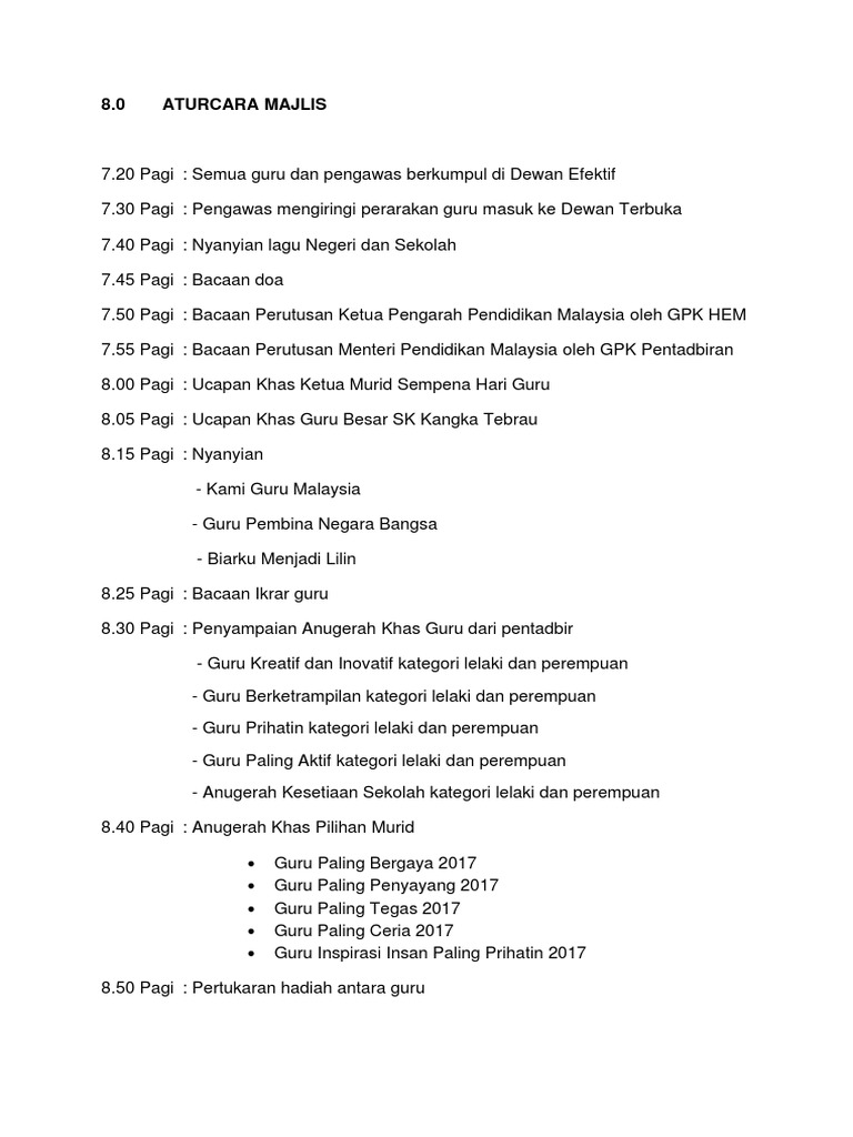 Sample Aturcara Sambutan Hari Guru. Nyanyian Lagu Negaraku diikuti lagu rasmi Negeri dan lagu rasmi sekolahVIP mengambil tempat di hadapan pentas sejurus. BUKU ATURCARA HARI GURU 2021.